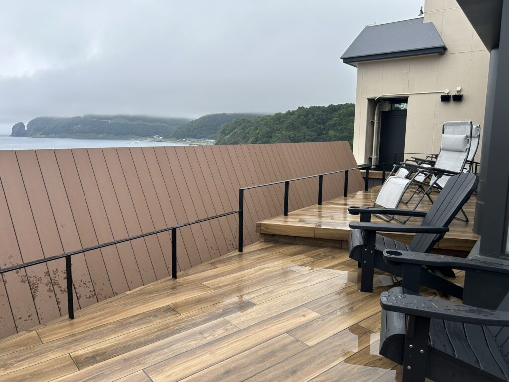 水風呂から上がった後は、いよいよ外気浴。専用の「TOKONOU TERRACE」にはリクライニングチェアが並び、目の前にはオホーツク海が広がります。