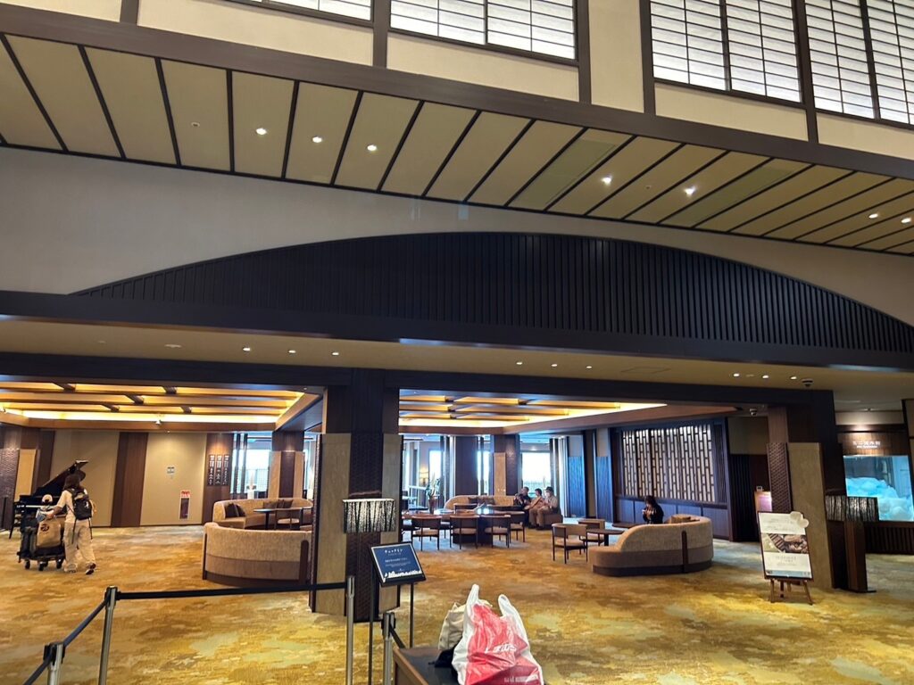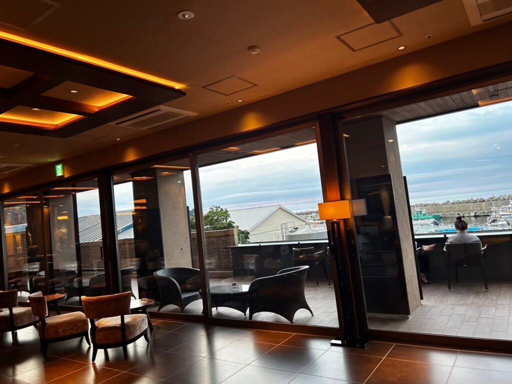 ロビーはガラス張りで、海の景色がそのまま切り取られたような開放感があります。