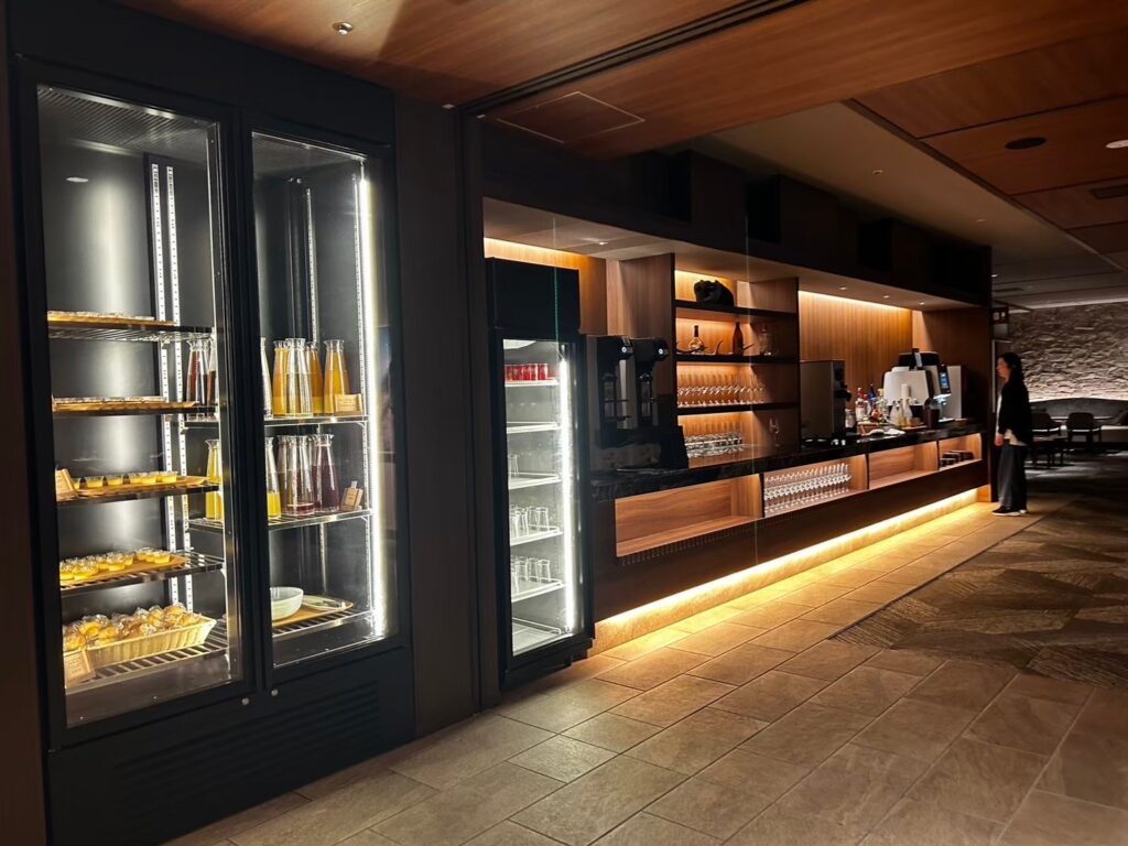 ラウンジでは好きな時にアルコールや食事などが楽しめます(午前中はアルコールの提供なし)。