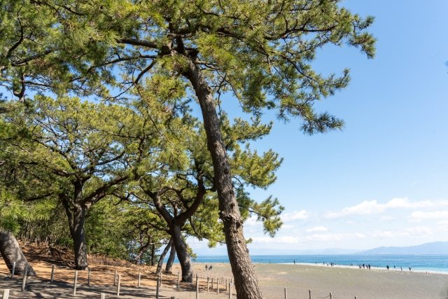 総延長7kmにわたる3万6千本以上の松林と、駿河湾越しに望む富士山・伊豆半島の眺めは圧巻。青い海と白い砂浜、緑の松が織りなす景観はまさに絶景です。しきじから車で約20分。
